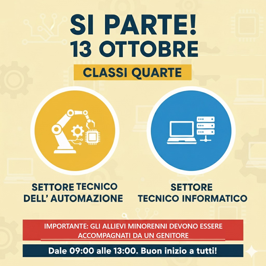 Il 13 OTTOBRE dalle 9 alle 13 iniziano le classi Quarte del settore AUTOMAZIONE (4B) e INFORMATICA (4T).