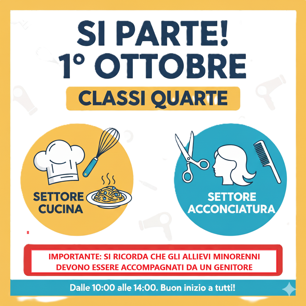 il 1° OTTOBRE dalle 10 alle 14 iniziano le classi Quarte del settore CUCINA e ACCONCIATURA.